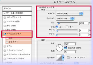 【レイヤー→レイヤースタイル】を選びます。すると左の画像のようなウィンドウが開きます。 「ベベルとエンボス」にチェックを入れて、スタイルは「ベベル(内側)」、テクニックは「ジゼルハード」を選びます。