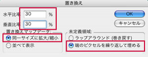 複製のレイヤーで作業をします。【フィルタ→変形→置き換え】を選びます。 左のようなウィンドウが開きます。水平比率、垂直比率を適当な数値にし、 「置き換えマップデータ」は「同一サイズに拡大/縮小」 、「未定義領域」は「端のピクセルを繰り返して埋める」 を選びます。