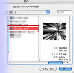 そこで、先ほど作っておいた「置き換え.psd」 という画像を選択して開きます。
