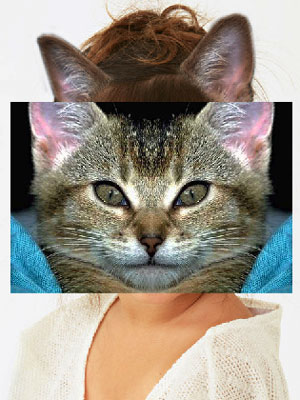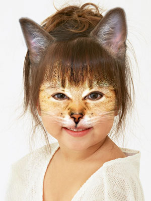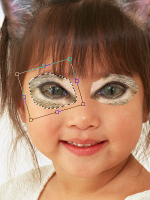 猫の顔の部分の半分をコピー&ペーストします。【編集→自由変形】で、少女の顔の大きさにあわせます。猫のレイヤーの不透明度を50%ぐらいにして作業するとやりやすいです。