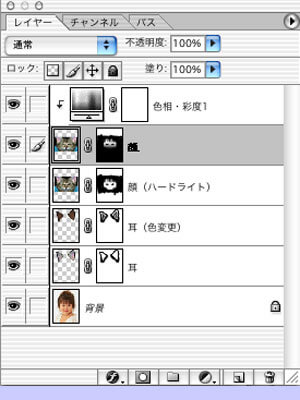 このレイヤーの頬の部分をレイヤーマスクで少し消して、ハードライトの猫のレイヤーが透けて見えるようにします。