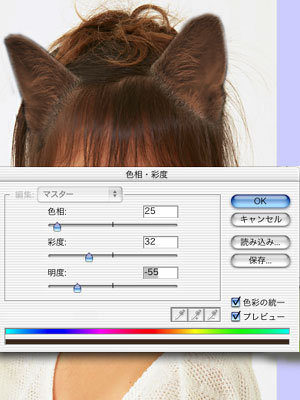 【イメージ→色調補正→色相・彩度】を選びます。「色彩の統一」にチェックを入れて、髪の毛の色に近くなるようにスライダを調節してください。